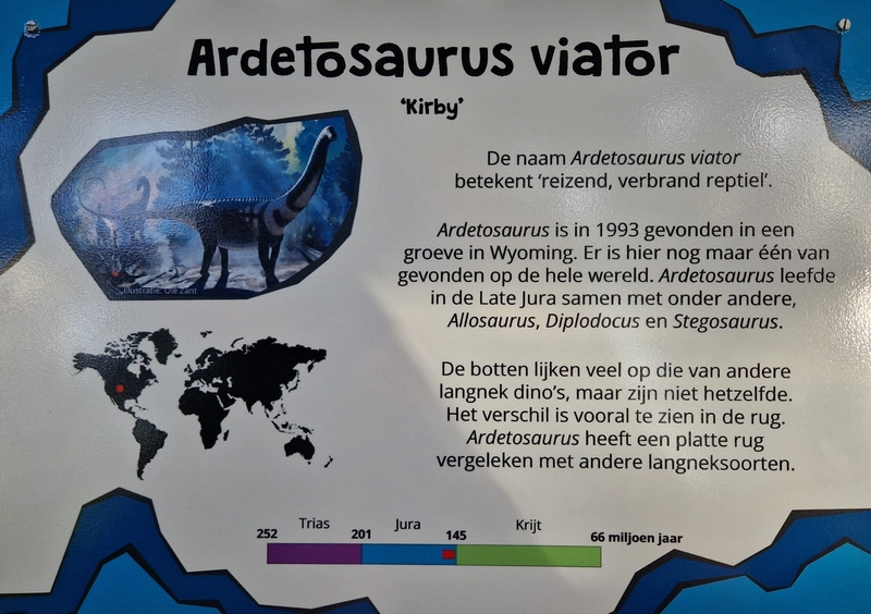 Een door een Nederlandse stagiair ontdekte dinosaurussoort heeft dinsdag een naam gekregen: Ardetosaurus viator. Een reconstructie van het skelet van de langnekdinosaurus staat in het Oertijdmuseum in Boxtel.