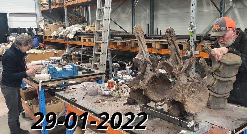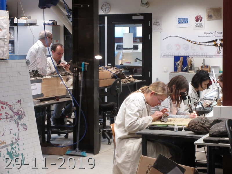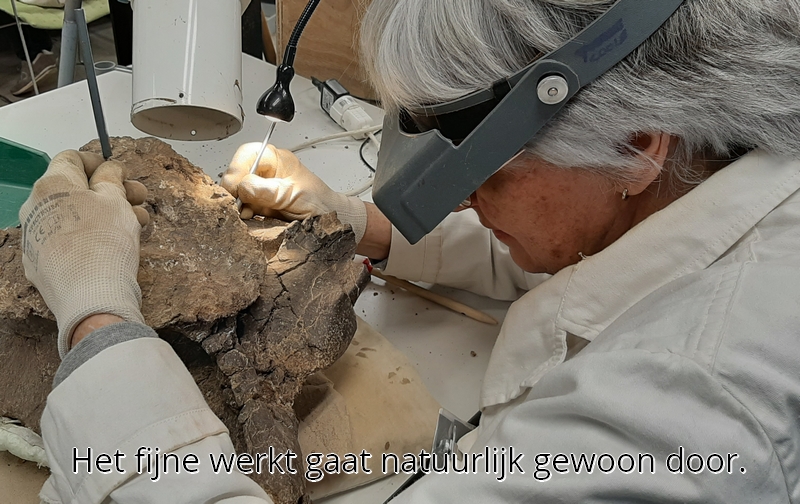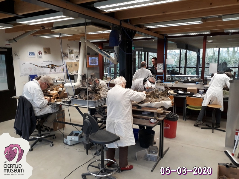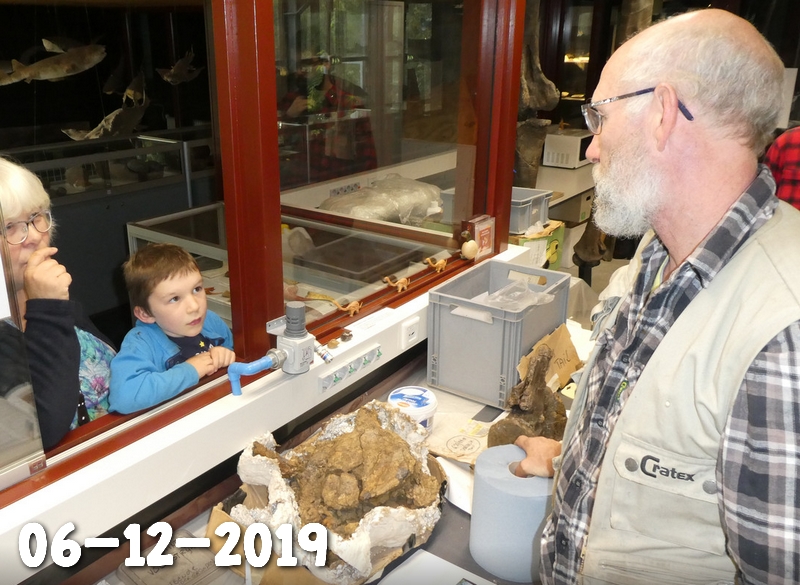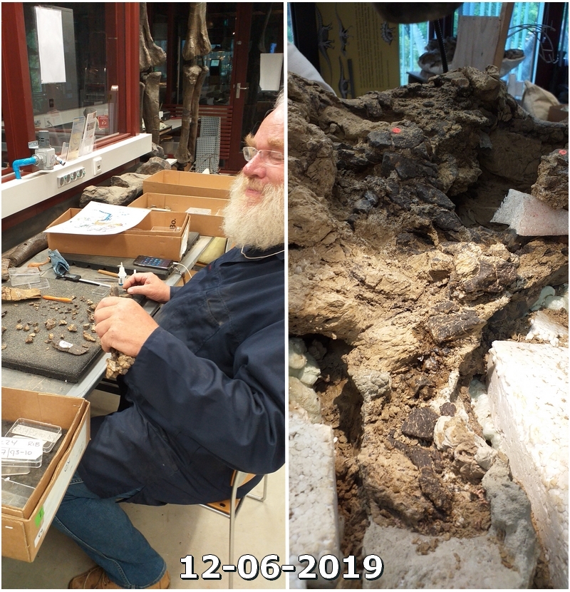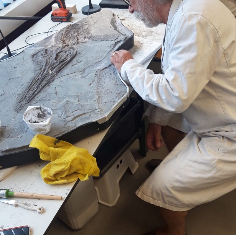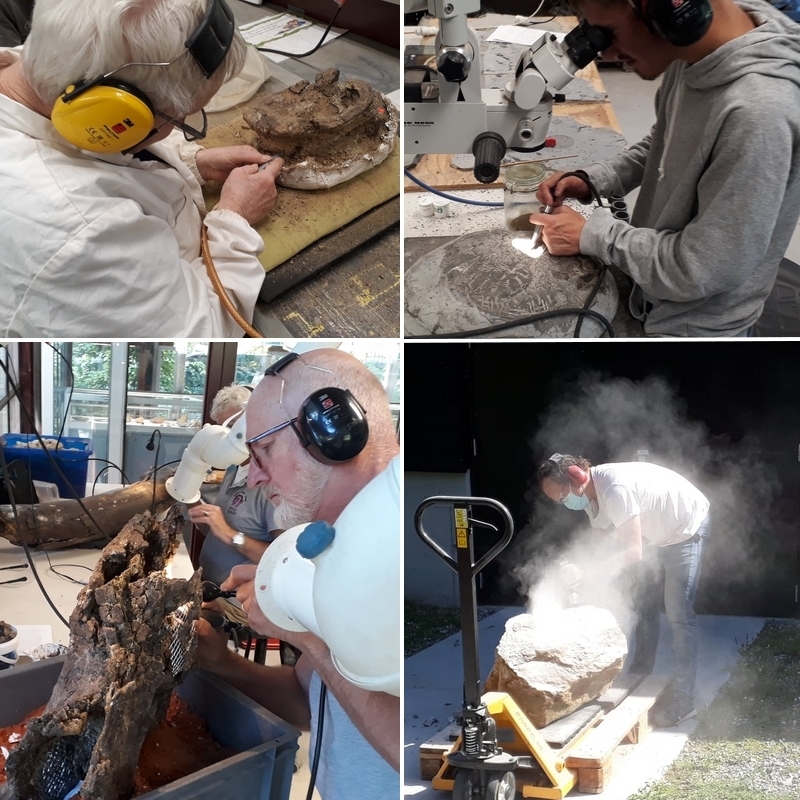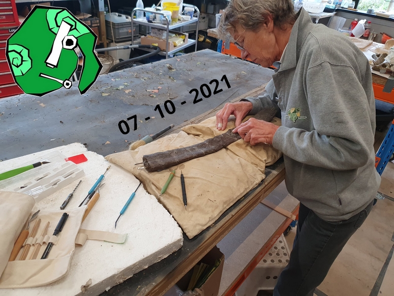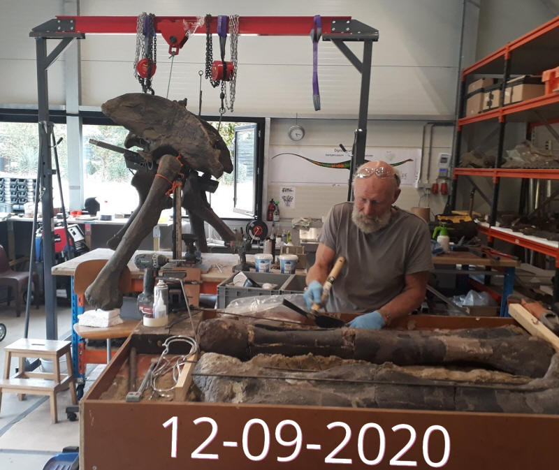 25-08-202. Er wordt weer heel veel en divers werk verzet in de laboratoria van het Oertijdmuseum. Een grote mammoetslagtand wordt geconserveerd, een grote beenvis Lepidotes elvensis uit het Toarcien van Dotternhausen komt langzaam tevoorschijn uit een nodule, diverse dinosaurusbotten uit de USA en Portugal worden vrijgelegd .... kortom ons publiek heeft genoeg te zien en te vragen.